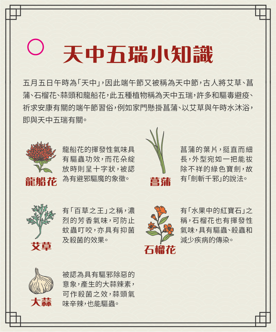 觀旅局說明,農曆5月5日午時為「天中」,因此端午節又稱天中節,古人將艾草、菖蒲、石榴花、蒜頭和龍船花,五種植物稱為天中五瑞,與許多端午節習俗都有相關,如家門懸掛菖蒲、以艾草與午時水沐浴。今年為壬寅虎年,觀旅局以「天中五瑞」為元素,以「午虎康」為主題,寓意五虎安康、有好康,介紹劍井取午時水的人文歷史與端午節傳統民俗活動。