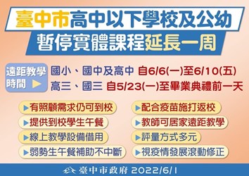 台中市高中以下學校原訂暫停實體課程至6月2日止,並改採遠距教學,公幼部分暫停實體教學,私幼則開放與家長協商後自行決定停課與否。經台中市政府教育局聽取七大家長團體意見後,台中市長盧秀燕今(1)日再宣布「停課不停學」措施,決定於端午節連假過後再延一週,從6月6日至10日止暫停實體教學,後續將視疫情發展再滾動檢討。