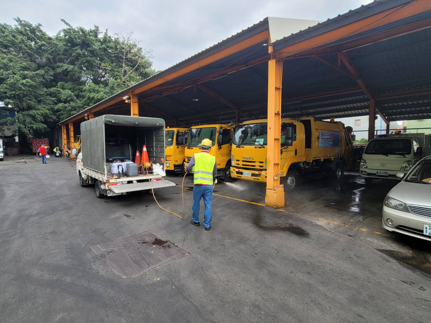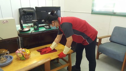新社區清潔隊長梁敬德表示,目前隊上無人確診,全體同仁都有高度防疫意識,保持社交距離及落實自主防疫,彼此都會提醒戴口罩、噴酒精,身體若有不適則主動快篩檢測,端午節隊部也不免俗掛上艾草與菖蒲,增添一點應景氣氛,另外每天針對辦公廳舍、同仁休息室及作業場區等公共區域,採用環保局推廣的「5055消毒法」,以一般市售漂白水(5%次氯酸納)稀釋50倍(濃度約為0.1%或1,000ppm)自製簡易消毒水,並將抹布浸泡5分鐘,每5小時擦拭1次,降低病毒存在機會,發揮如雄黃酒一般消毒去疫的效果。