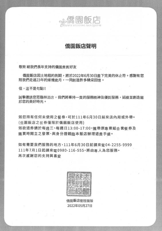 僑園飯店公布6/30停業 中市府消保官提醒餐券儘速使用或退費