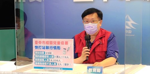 黃副市長表示,今明兩天台中第二劑兒童莫德納校園快打站登場,台中首創兒童疫苗快打站、也是最早開打第二劑兒童疫苗的縣市,預計1萬3,075位學童有意願在校園施打,全市共規劃26處兒童快打站,由教育局分配、集中施打。截至今天中午,有6,206位學童完成接種,除校園快打站,有880名兒童已在醫療院所完成接種,第二劑疫苗涵蓋率穩定增加。