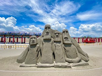 市府觀旅局表示,為滿足民眾因疫情無法出國旅遊的心情,今年以「異國風情」為沙雕主題,精心打造11座異國風情主題創意沙雕,將世界知名地標、異國特色風情搬到台中大安濱海樂園,享受偽出國的樂趣,更可到沙灘上踩沙踏浪,站上觀景平台俯瞰沙雕,將無敵美景盡收眼底,感受台中大安夏日風情。