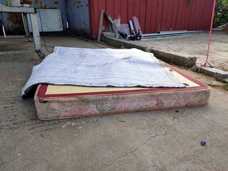 潭子區清潔隊長邱建宏表示,潭子區今年15月回收廢棄床墊計有1,219床,數量不少,因多為複合性材質,修復與處置不易。隊上魏光輝、蘇有騰兩位同仁在思考如何去化、再利用時,有感疫情期間,每當進出家門或辦公室時,腳底汙泥與砂礫可能潛藏新冠病毒,兩人化腐朽為神奇,憑著剪刀、美工刀與鉗子等簡易工具,把廢棄床墊中棉布料改造為防疫消毒毯,噴灑75%酒精於腳踏墊上,把病毒阻隔於門外,未來也將規劃創多樣化、多造型、多功能的棉製成品,配合資源回收宣導活動邀民眾響應。