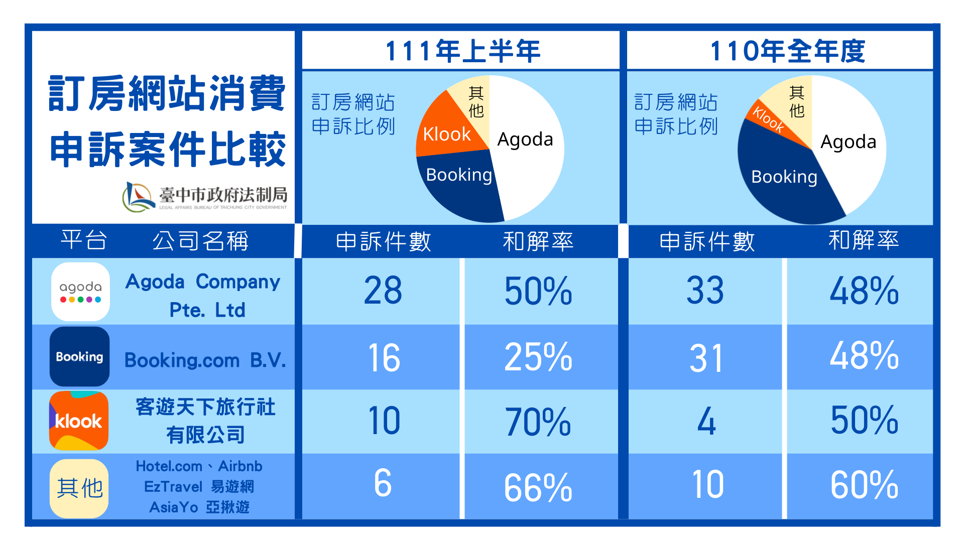 七月暑假旅遊旺季來臨!台中市政府法制局提醒,民眾若想規劃小旅行,因Agoda、Booking.com等境外訂房網站消費爭議多,今年截至6月15日止,就有60件境外訂房網站衍生的住宿爭議,提醒消費者在使用網站下單前,請先詳閱訂房取消條款,並查詢旅宿房源有無合法登記。