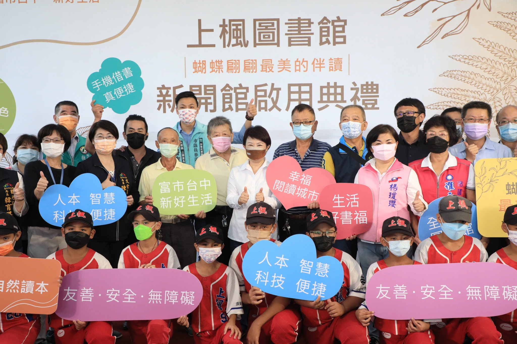 台中首座以「環境教育」為主題的上楓圖書館今(5)日開館,市長盧秀燕出席啟用典禮表示,上楓圖書館從購地、規劃到興建共歷經三任市長、10年時間,由市府分年編列總經費15,860萬元,透過跨局處合作,於上楓國小用地共構多功能圖書館及活動中心,打造全齡化的綠建築圖書館,更榮獲「建築園冶獎」及108年國家卓越建設獎最佳規劃設計類「卓越獎」殊榮。