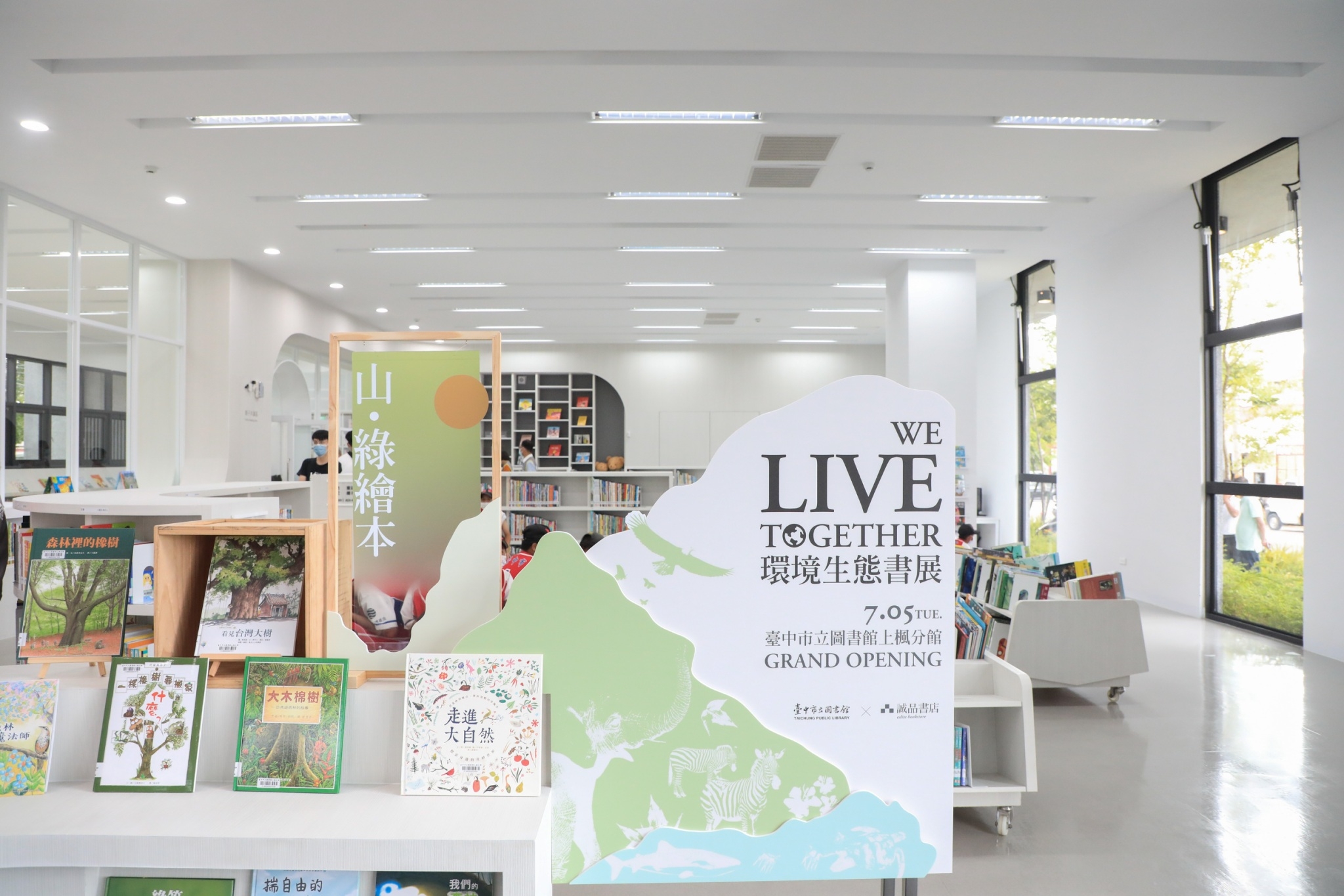 台中市立圖書館長張曉玲表示,上楓圖書館以環境教育為發展特色,蝴蝶時常翩翩飛舞進來伴讀,為開擴閱讀視野,增設戶外閱讀區「壩雅露台」提供民眾閱讀休憩的空間,並以生態草溝園區與上楓國小相鄰,是一座響應聯合國永續發展目標(SDGs)的自然生態智慧化圖書館。