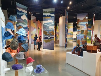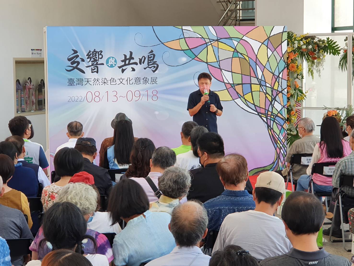 陳老師說明,「交響與共鳴」策展理念「色彩的交響.情感的共鳴」,是將對於色彩的共同記憶構築出專屬台灣的色彩文化意象,進而成為台灣發展染色工藝的重要資料庫。展區分成「主題意象」、「色系演繹」、「節氣風情」、「染纈應用」四展區,透過介紹、分類、解析與應用等不同面向,提供台灣染色工藝界更多運用題材,提升染色工藝水平,使色彩使用具有天然、環保的特性,讓人類與環境都能和平共存、永續發展。
