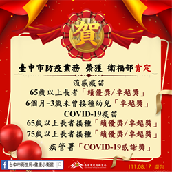 曾局長說明,中市「65歲以上長者」流感疫苗使用率全國第一,榮獲績優獎,也是全國唯一將長者疫苗採購量全數使用完畢的縣市,榮獲卓越獎殊榮;另在「6個月至3歲未曾接種幼兒」項目,採購的流感疫苗量已全數接種完畢,再獲卓越獎肯定。