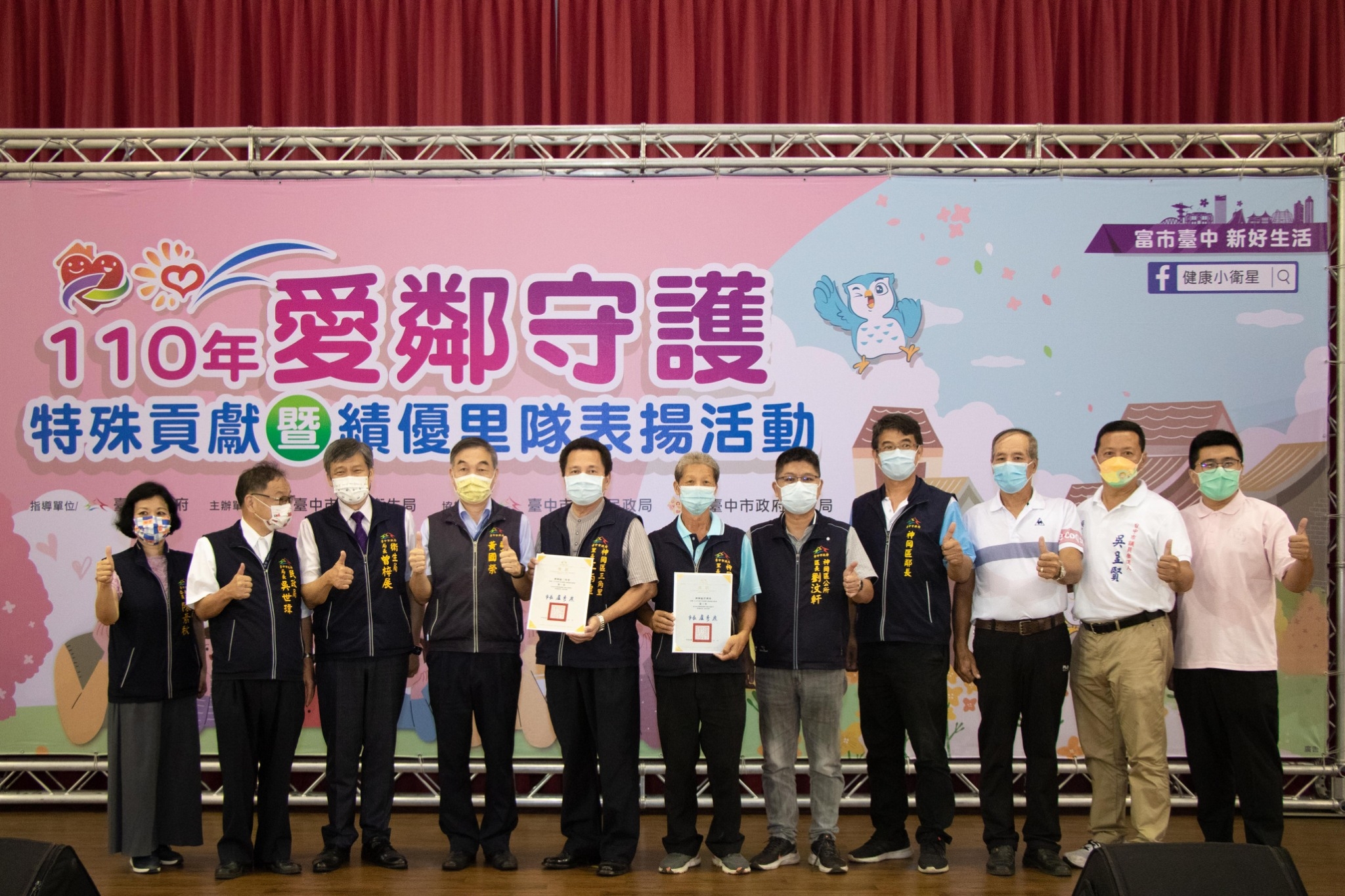 台中市政府今(24)日於西屯區公所舉辦「110年愛鄰守護特殊貢獻暨績優里隊表揚活動」,副市長黃國榮代表市長盧秀燕頒發豐原區豐田里、潭子區東寶里、大甲區頂店里、大安區龜壳里、太平區中興里、西屯區大鵬里、南屯區文心里、西區公益里、南區南門里、北區錦村里10隊愛鄰守護特殊貢獻里隊及91隊績優里隊,感謝他們協助台中防疫,為市民創造幸福。