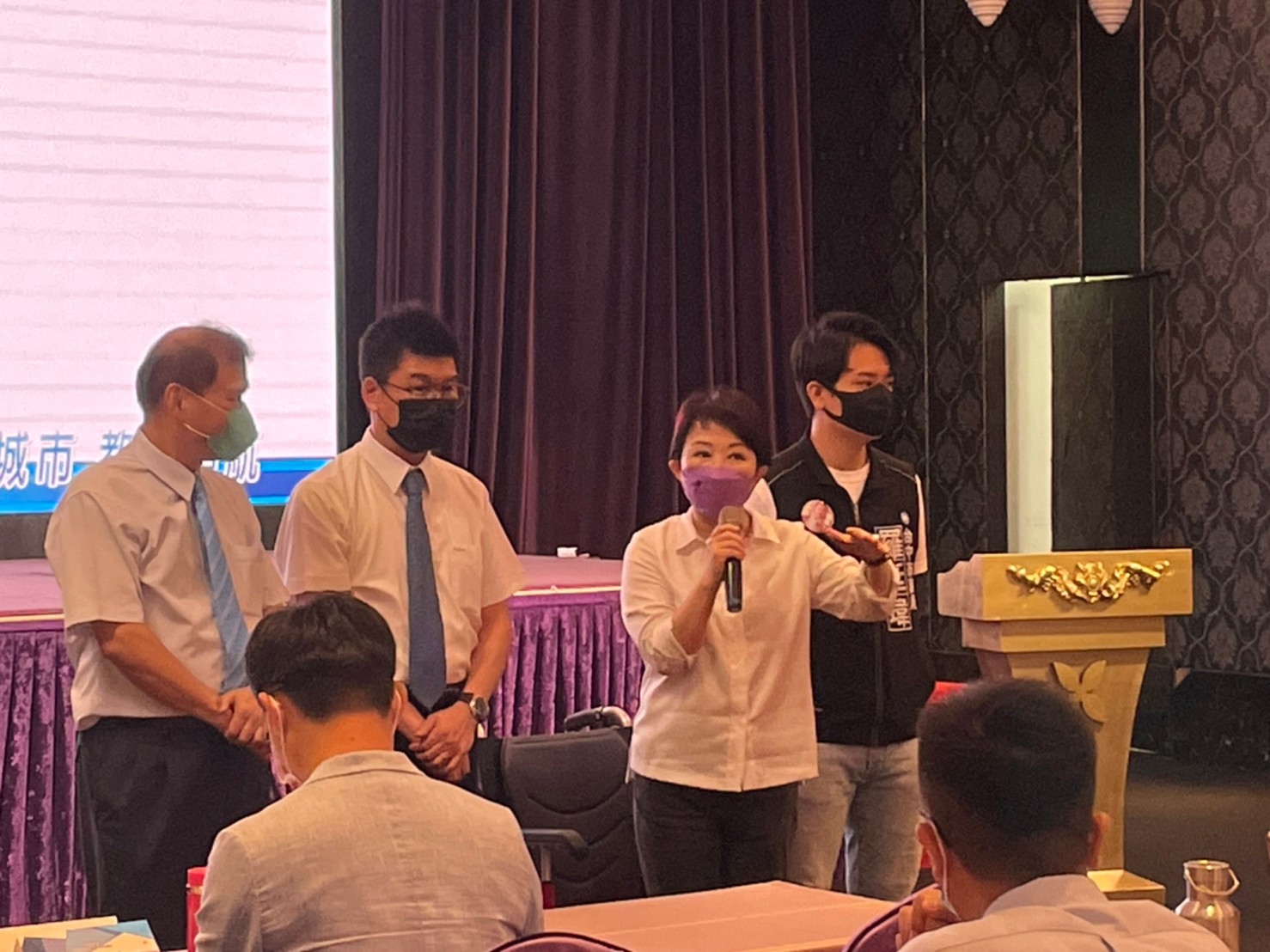 盧市長說,感謝校長及老師們在疫情期間的付出,保護學生健康也兼顧受教權,共同守護校園社區環境,抗疫工作持續進行,市府與學校一起努力。另副市長令狐榮達也在會中頒發防疫英雄勳章,感謝疫情期間協助施打疫苗的有功教育人員。