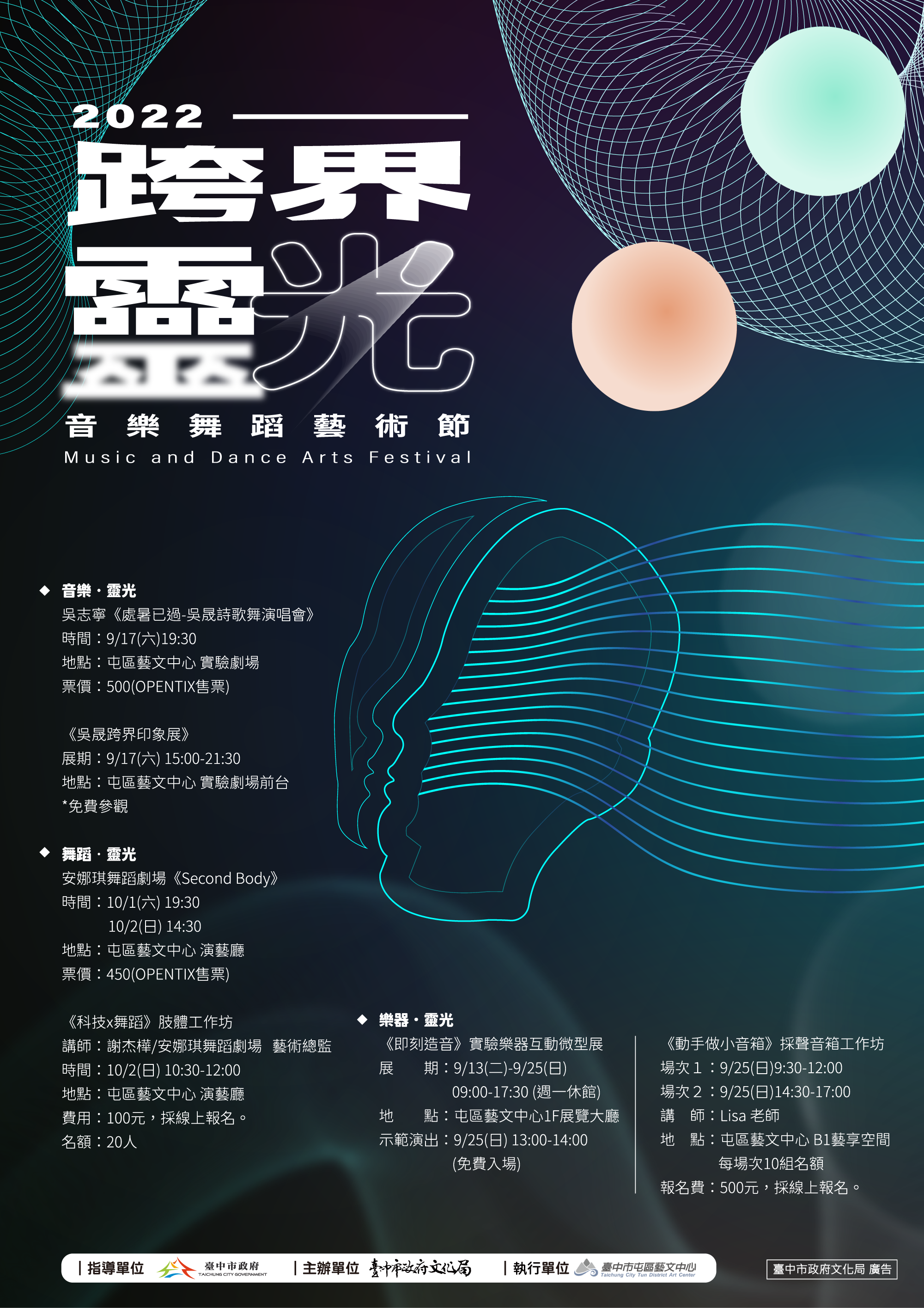 「2022音樂舞蹈藝術節」9月13日起跑!中市屯區藝文中心表示,今年以「跨界˙靈光」為主題,邀請金音獎入圍歌手吳志寧、TAIWAN TOP演藝團隊「安娜琪舞蹈劇場」與實驗聲響創作團隊「一公聲藝術」等團隊,帶來3場演出、2檔展覽與2場工作坊,呈現文學詩歌、科技舞蹈及實驗樂器裝置等精采跨界展演,即日起開售票及開放活動報名,歡迎民眾把握機會參加。