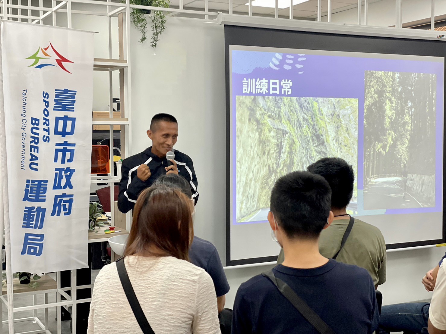 台中市政府運動局鼓勵市民運動促進健康,與在地企業運動品牌迪卡儂合作於今(24)日舉辦「111年台中之光運動推廣講座」,邀請台中之光,有「黑色閃電」稱號的馬拉松好手蔣介文分享賽事心路歷程與訓練經驗。運動局長李昱叡表示,市長盧秀燕期盼透過多面向的運動推廣,打造台中為「酷運動、酷城市」,希望透過講座培養市民運動興趣,帶動市民建立良好運動習慣。