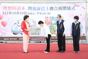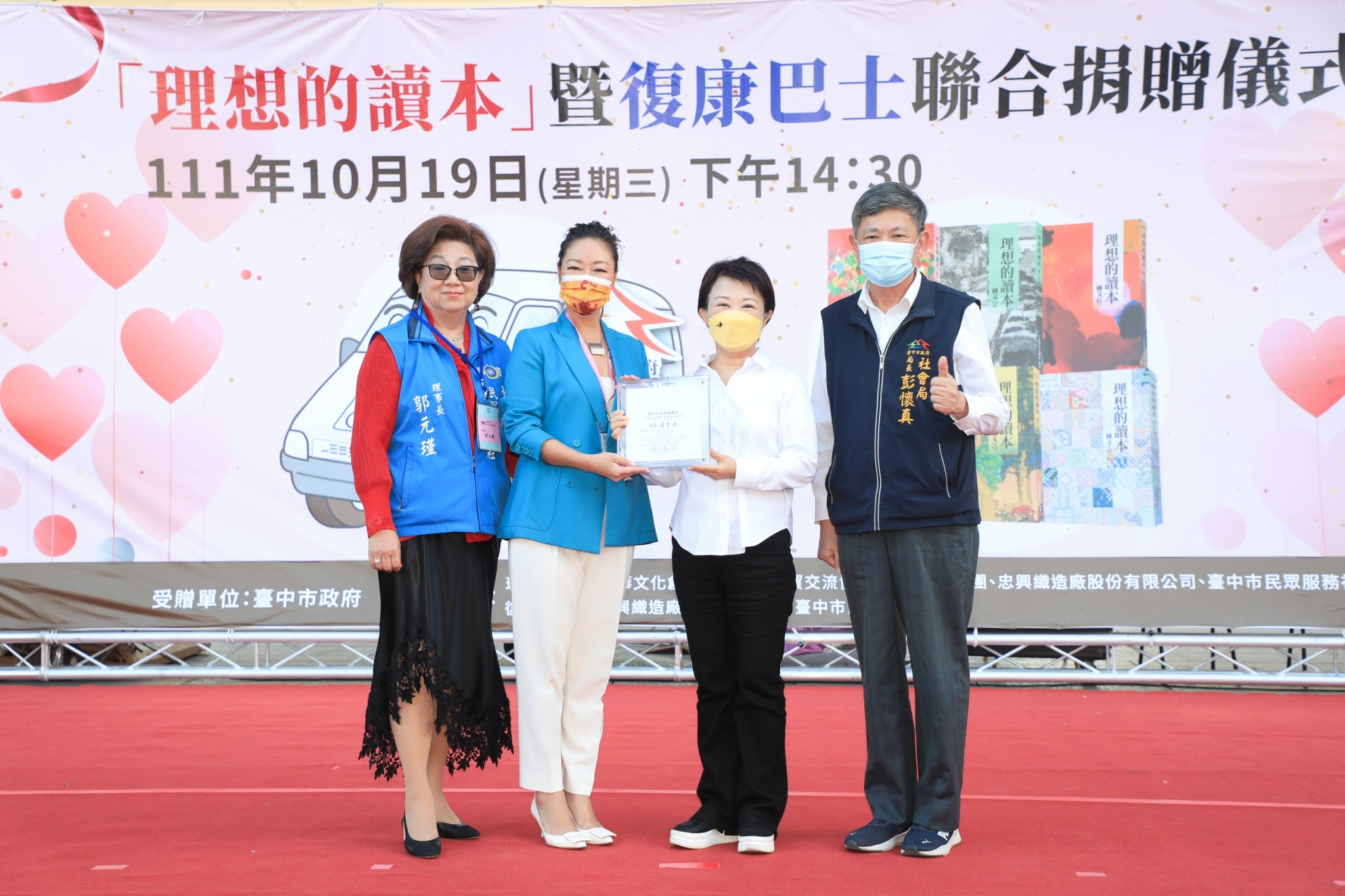 台中市市民服務社、世界夫人集團、中華文化創意產業發展經貿交流協會、忠興織造廠及一爐香文化事業等民間團體贈送《理想的讀本,國文1至國文8》給市立25所高中職、70所國中與台中市45間圖書館,共725套,充實學校及圖書館館藏資源,另捐贈市府社會局1輛復康巴士,市長盧秀燕今(19)日出席捐贈儀式表示,感謝協助提升社會良善價值,嘉惠市民與學子。