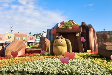 觀旅局提到,展區以「心花開」大門迎賓,數棟充滿綠意的可愛建築為入口意象,主花毯「希望莊園」總高10米,莊園中數幢建築各別住著小精靈們,每日上午10時至下午3時整點展演主花毯秀時,小精靈們將會現身與民眾打招呼,百合花叢中誕生的「花仙子」靈巧可愛,帶著不同個性的「小精靈」在幸福花園裡尋找幸福解方。