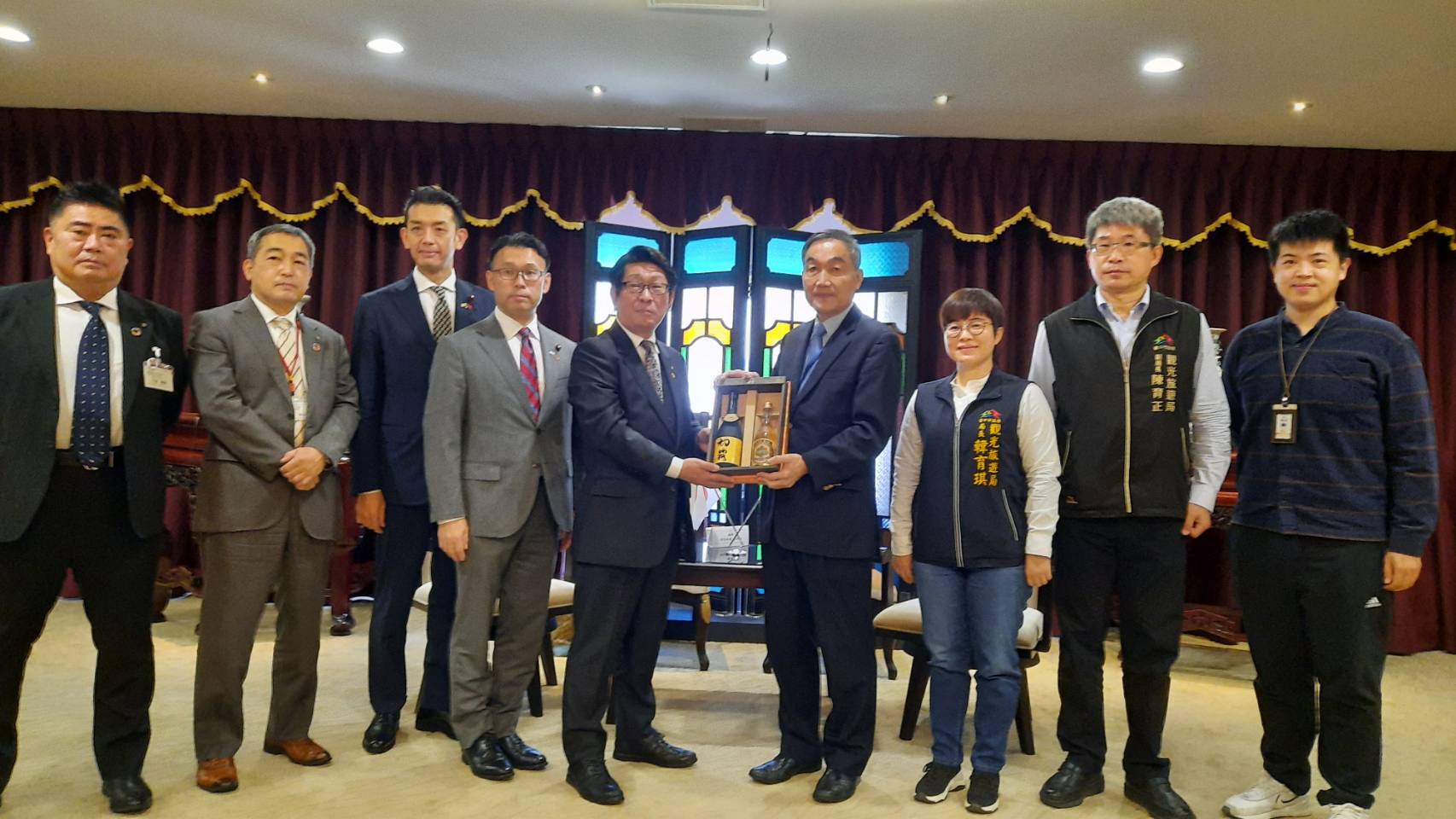 會後藤田會長致贈「有松・鳴海絞」桌巾飾品予黃副市長,並邀請黃副市長來名古屋市「有松」小鎮,體驗流傳400年成為日本遺產的染織工藝文化;市府則回贈充滿台日歷史意義的台中公園湖心亭漆器。(12/10*10)*觀光旅遊局