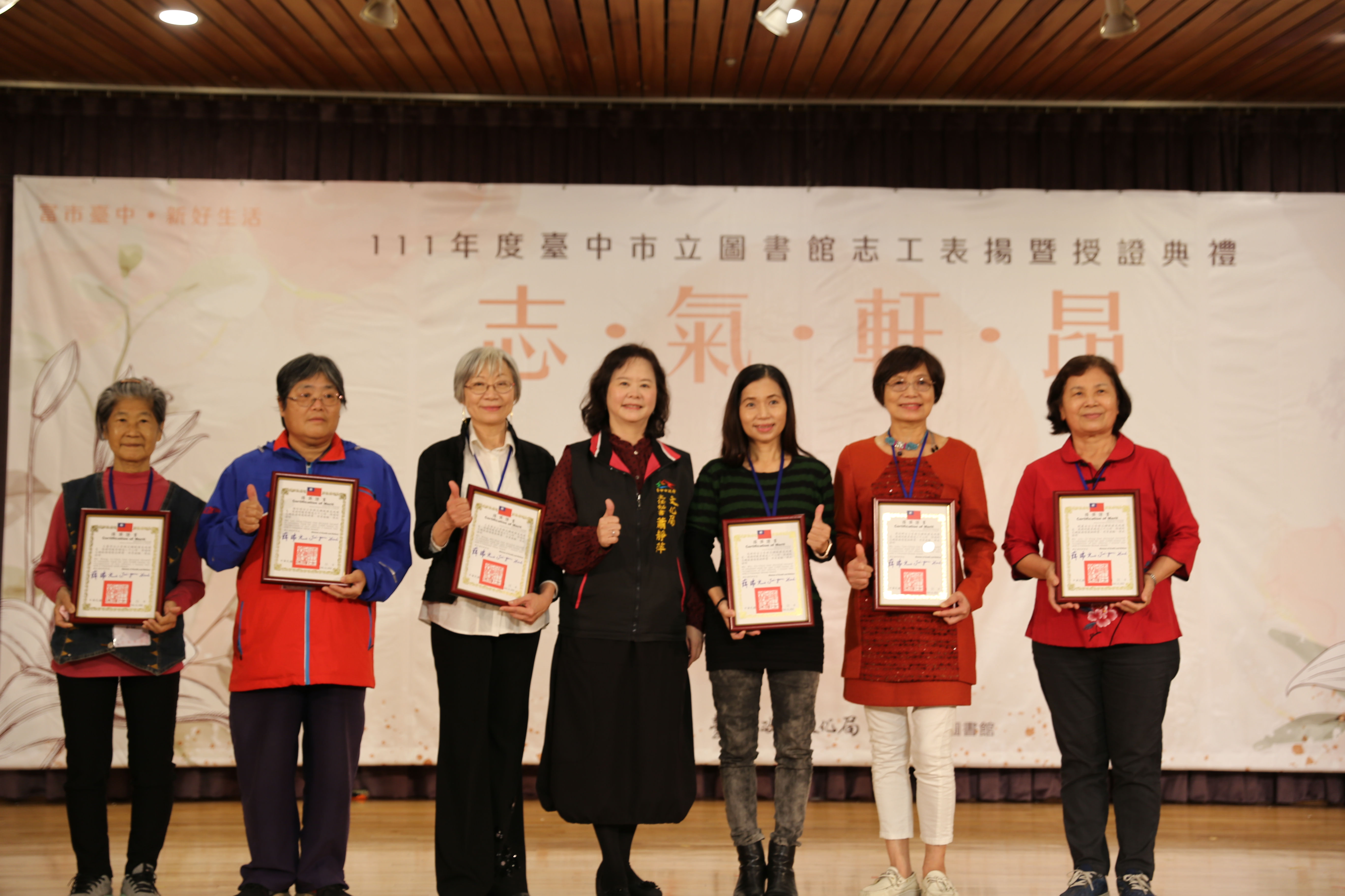 熱情完勝疫情!台中市立圖書館志工隊今年在疫情影響之下,志工人數突破2,000名、年度服務總時數更高達16萬小時,一舉刷新志工隊成立以來新紀錄!今(10)日下午在大墩文化中心舉辦「志氣軒昂!111年志工表揚暨授證典禮」,台中市政府文化局主任秘書蕭靜萍出席典禮表示,台中市無論在整體閱讀力、每人借閱冊數方面,都是六都中表現績優城市,圖書館志工團隊正是推動城市閱讀最大的動能,感謝圖書館每位志工的辛苦奉獻!