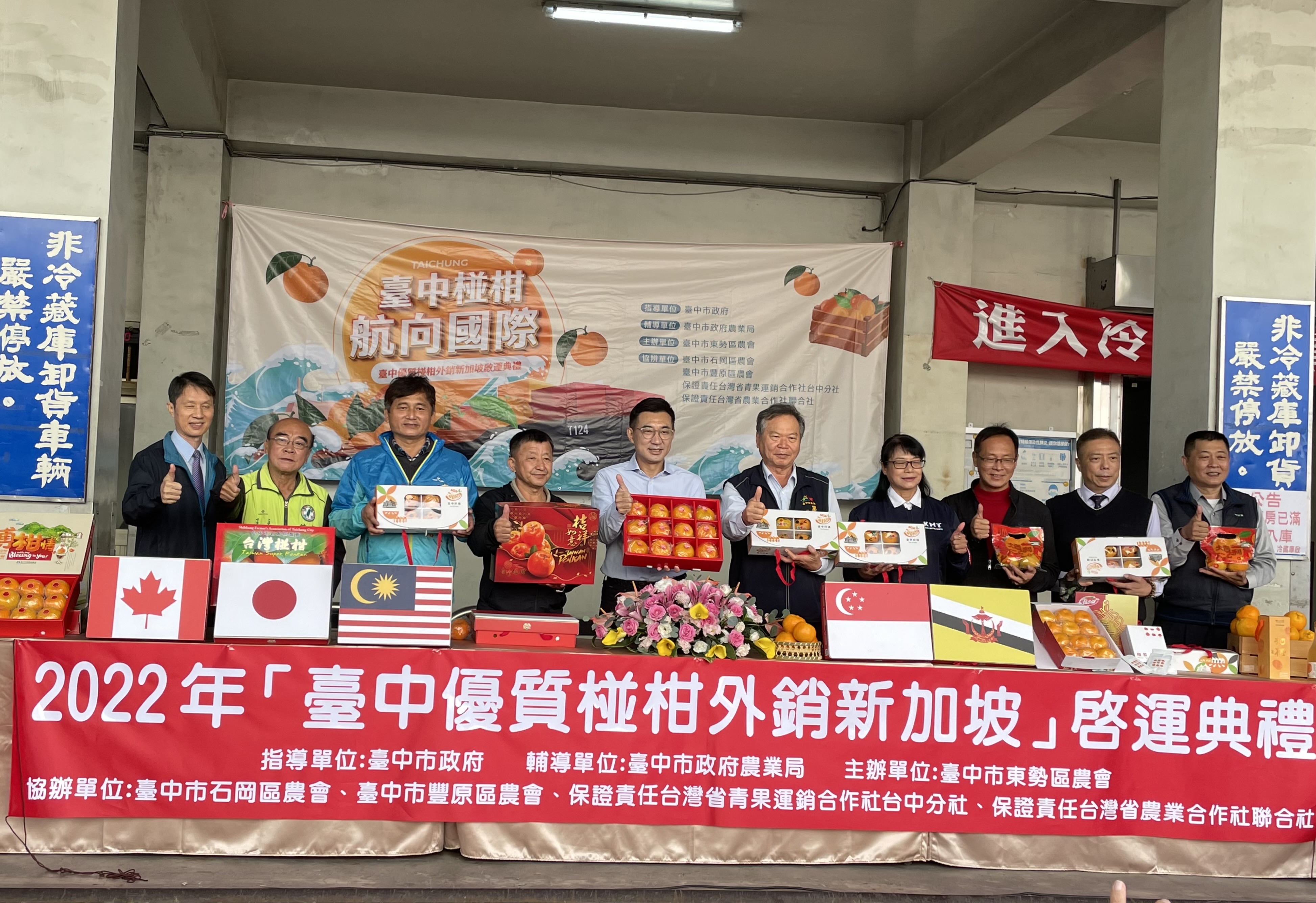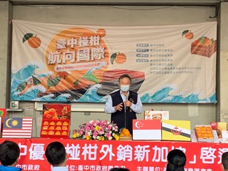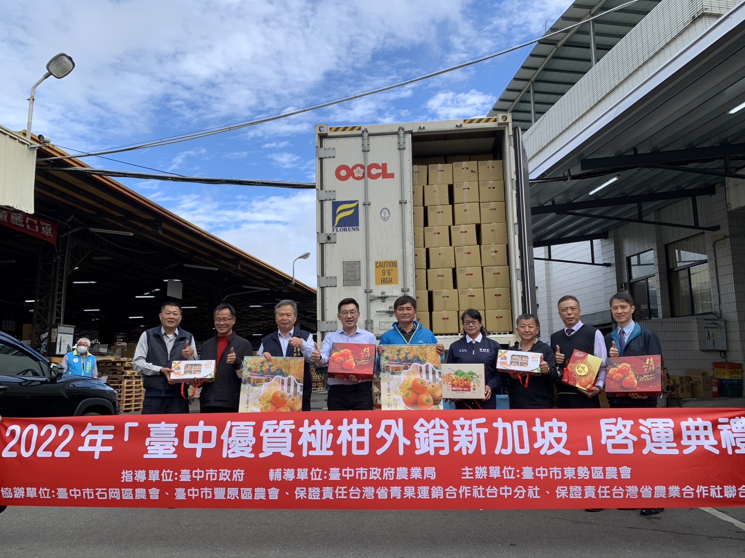 台中市政府農業局積極輔導農民團體外銷農特產品,平衡國內市場供需,穩定價格,成功將台中生產的優質椪柑外銷至新加坡,今(16)日於東勢果菜市場舉辦「台中優質椪柑外銷新加坡啟運典禮」,啟運1櫃(20公噸),後續也將陸續出口至新加坡、馬來西亞、汶萊及日本等國家,預計外銷650公噸優質椪柑。