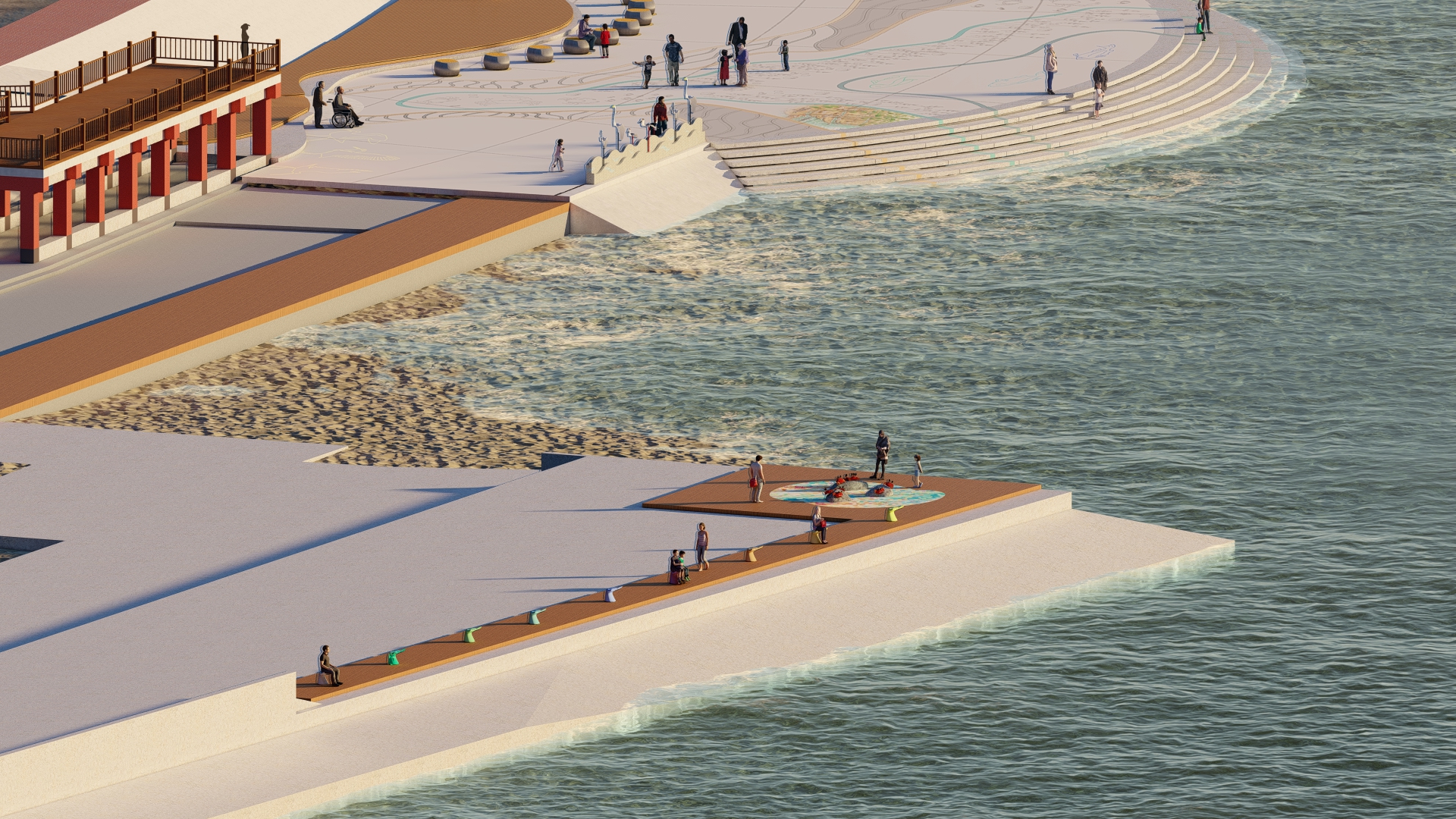 觀旅局長陳美秀說明,這次工程除優化北園既有廣場堤岸整體結構與提升安全性,同時形塑場景意象,凸顯基地的潮間帶特性及襯托海岸線的夕陽景致;另也規劃生態意象亮點設施、利用生態拓印工法進行廣場改造、增設造型意象座椅等,推廣在地豐富的濱海生態,並連結大安港「海翁窟港」的歷史脈絡,透過整合性的發展與濱海樂園戲水區景觀優化改善,創造遊客良好的遊憩體驗。