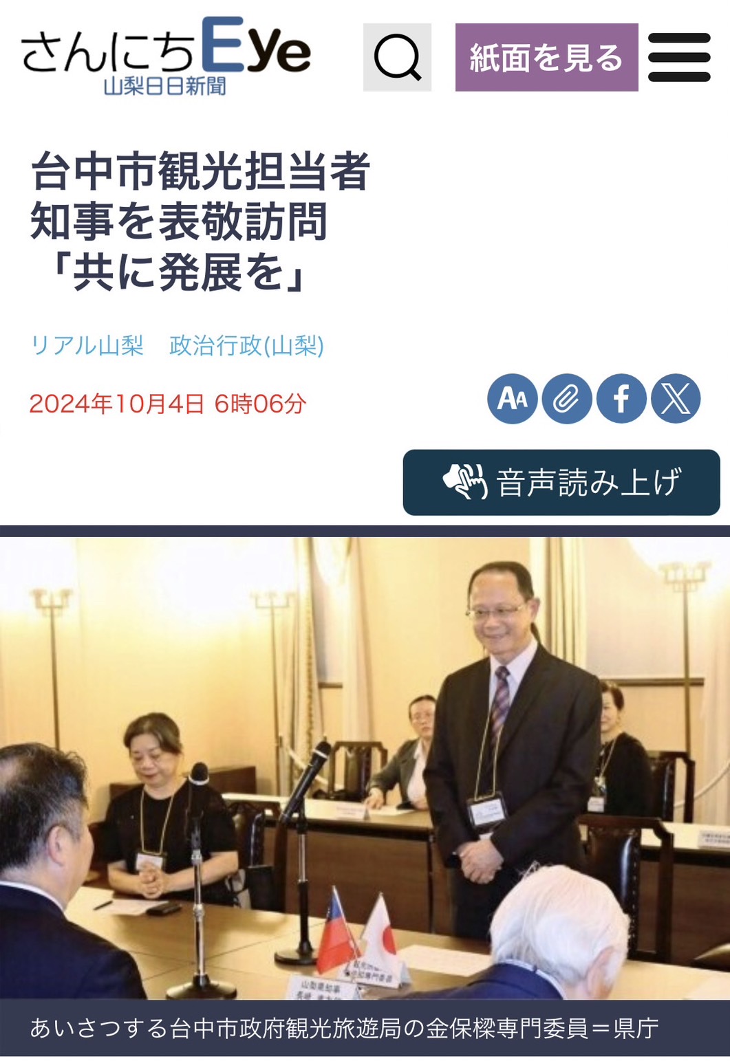 觀旅局說明,赴日行程因颱風攪局充滿不確定性,山梨縣知事長崎幸太郎與北杜市長上村英司、甲州市長鈴木幹夫、山梨縣日台友好議員聯盟淺川力三會長及6名議員與觀光單位代表得知,台中市訪問團不畏風雨而來,熱情接待,展現日台友好情誼,山梨日日新聞也特別刊登報導。山梨縣長崎知事致詞時表示,盼此次台中市來訪能開啟雙方更進一步合作的契機,風雨中生信心,對未來雙邊的交流展現出高度期待。