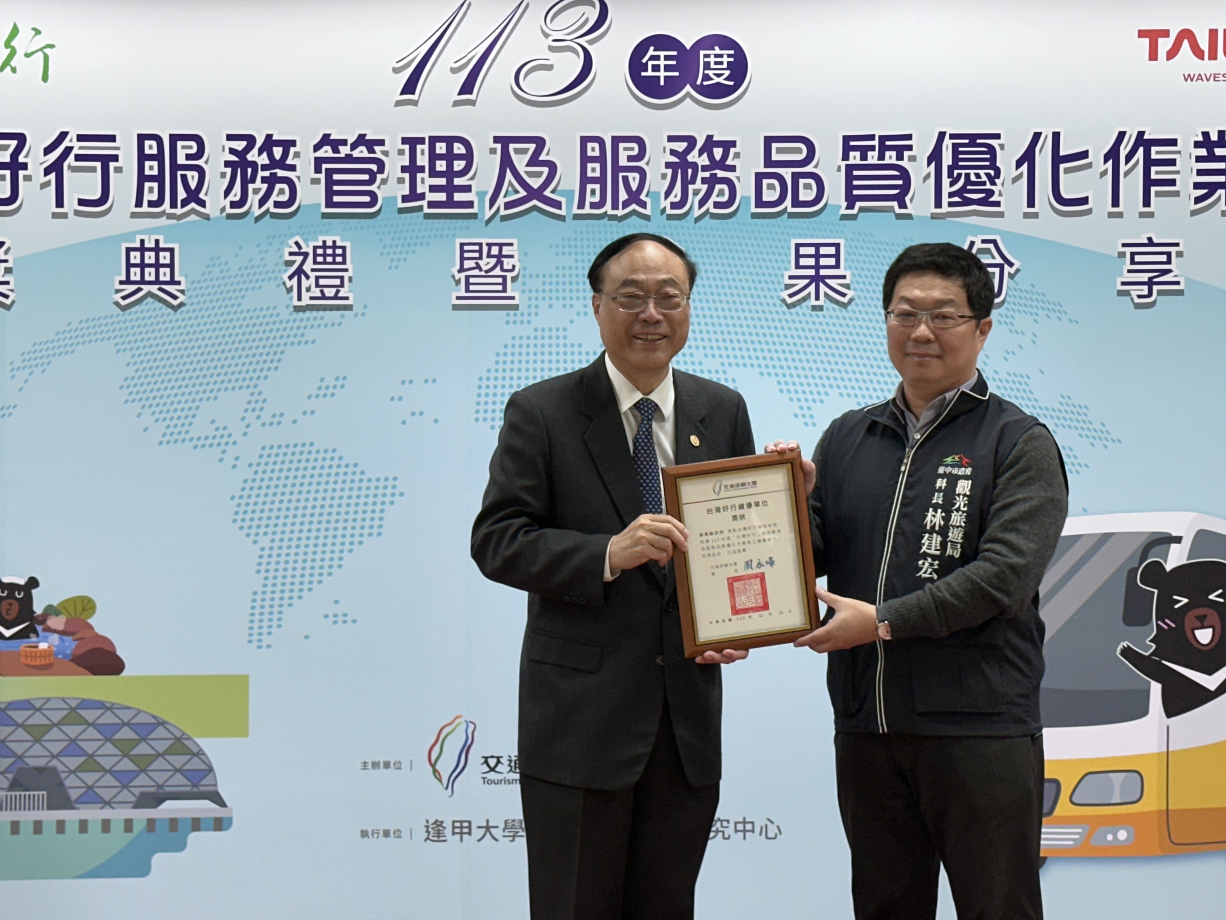 台中市政府推動台灣好行獲得佳績,交通部觀光署昨(23)日舉辦113年度「台灣好行服務管理及服務品質優化作業案」頒獎典禮,中市府首次榮獲「優等」殊榮,展現出市府與客運業者攜手致力推動觀光運具服務的創新成效,從台灣好行11台中時尚城中城線、888豐后線,到今年8月新上路的889大雪山線,創新結合旅遊路線特色打造車體五感體驗特色,為台中觀光注入嶄新亮點。