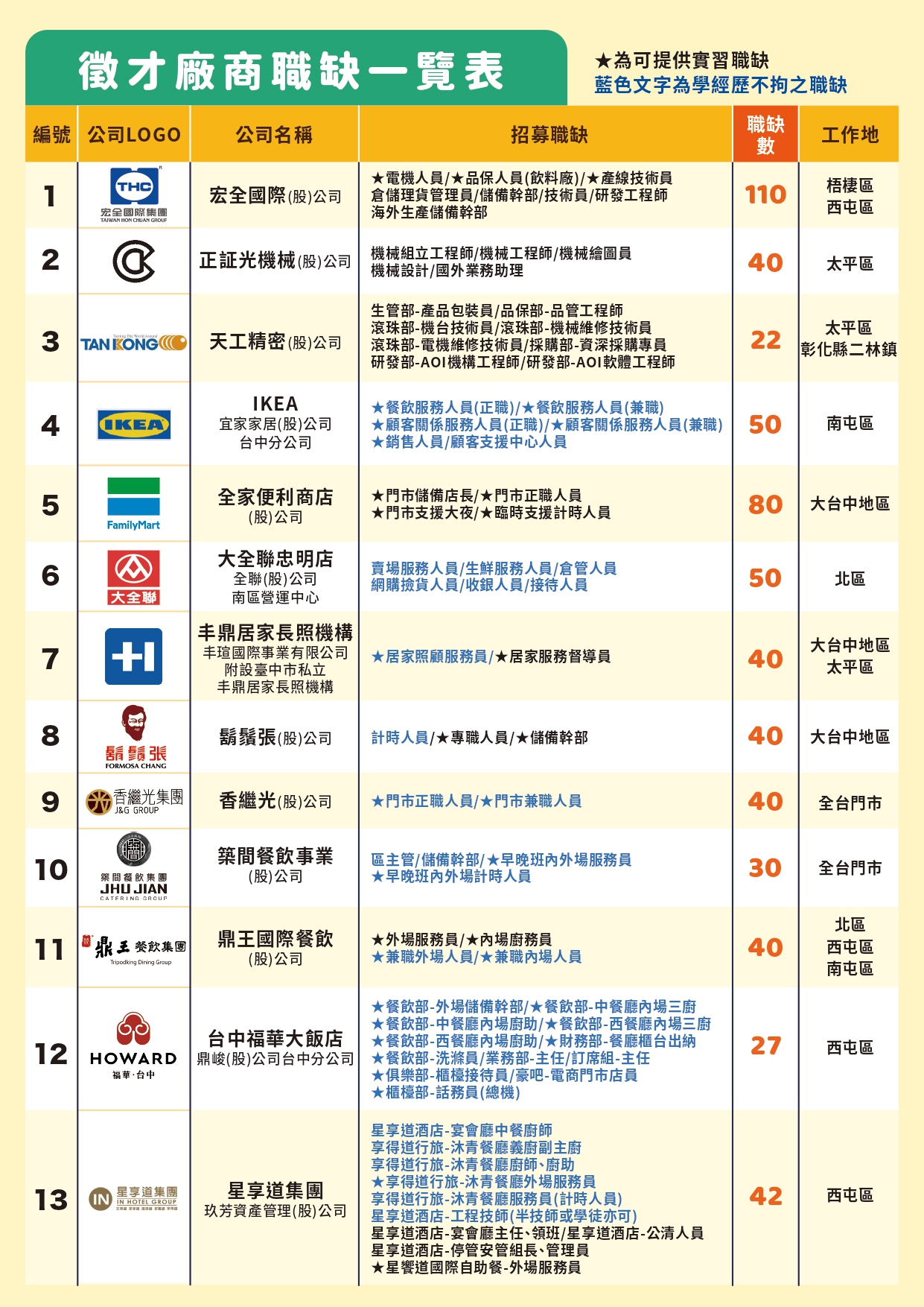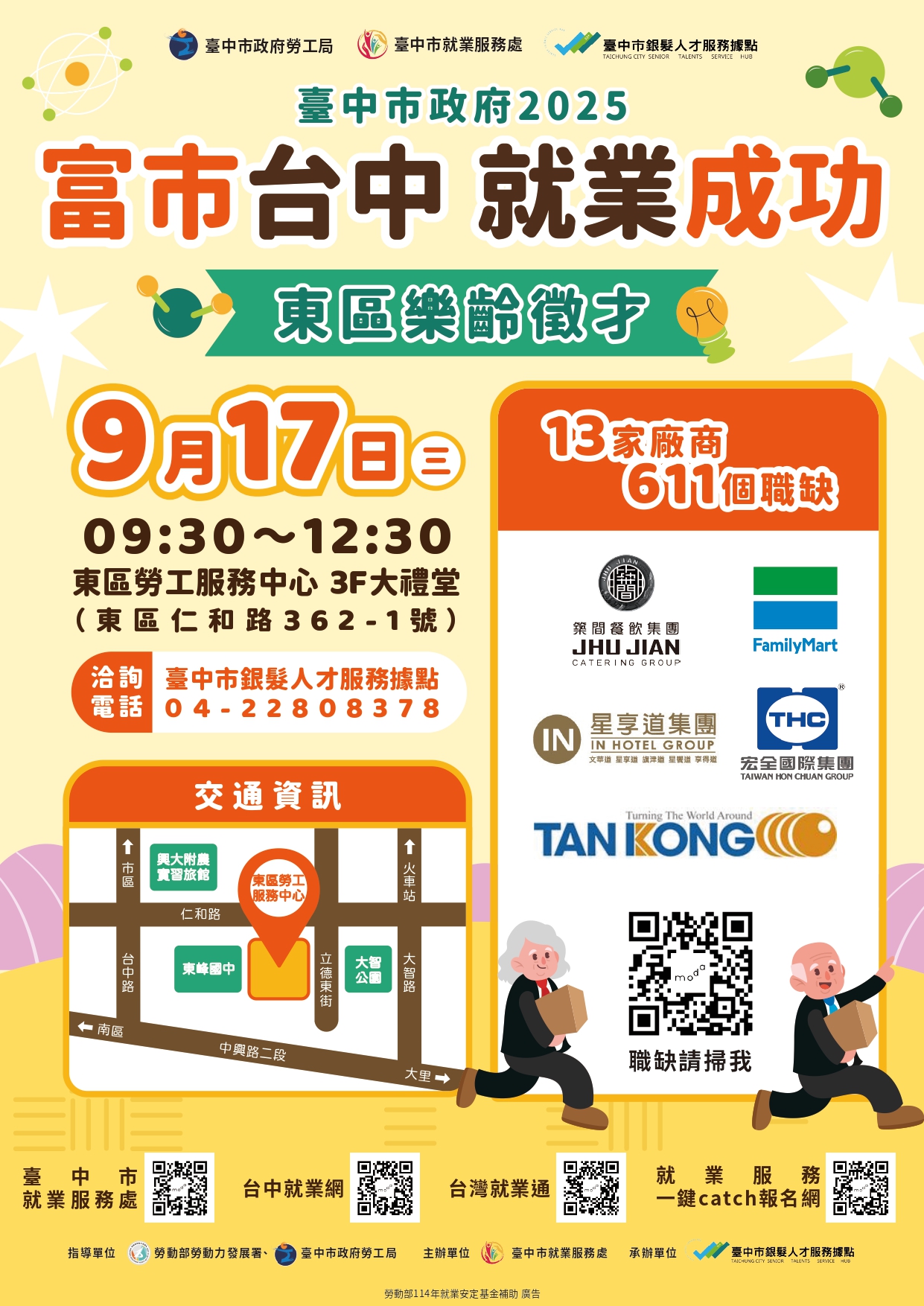 臺中市政府9月17日上午9:30至12:30,在東區勞工服務中心3樓禮堂舉辦2025「富市台中 就業成功」東區樂齡徵才,邀請築間餐飲事業、全家便利商店、星享道集團、宏全國際、天工精密等13家企業徵才,提供611個工作機會,查詢職缺資訊:https://gov.tw/Ueq,詳情請洽04-22808378臺中市銀髮人才服務據點洽詢。