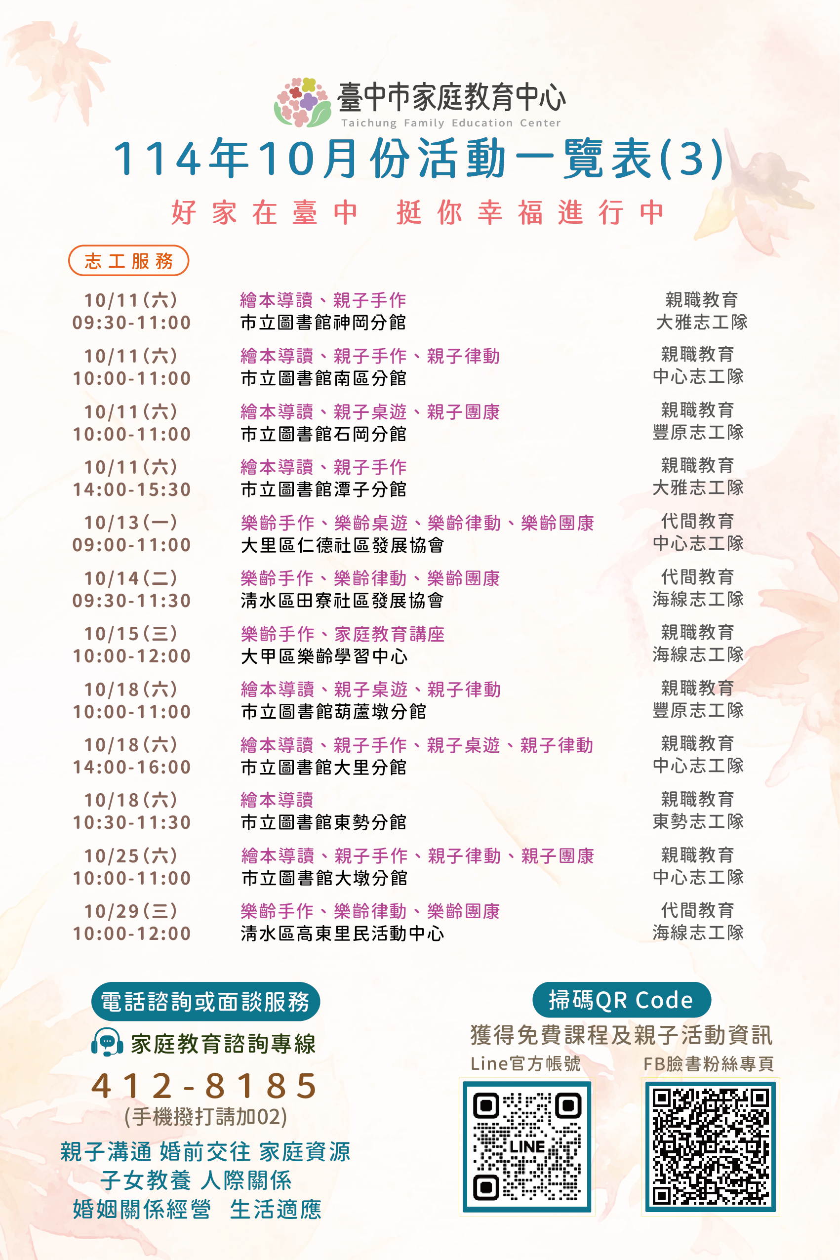 臺中市家庭教育中心邀您一起參與本月精彩多元的課程活動~從親職教育、數位教養、婚姻經營、青少年溝通、情緒管理、幼兒教養到原住民族家庭教育、子職關係探索、婚前交往準備等主題應有盡有,讓我們在溫馨互動的氛圍中學習,累積創造幸福、和諧家庭的力量!