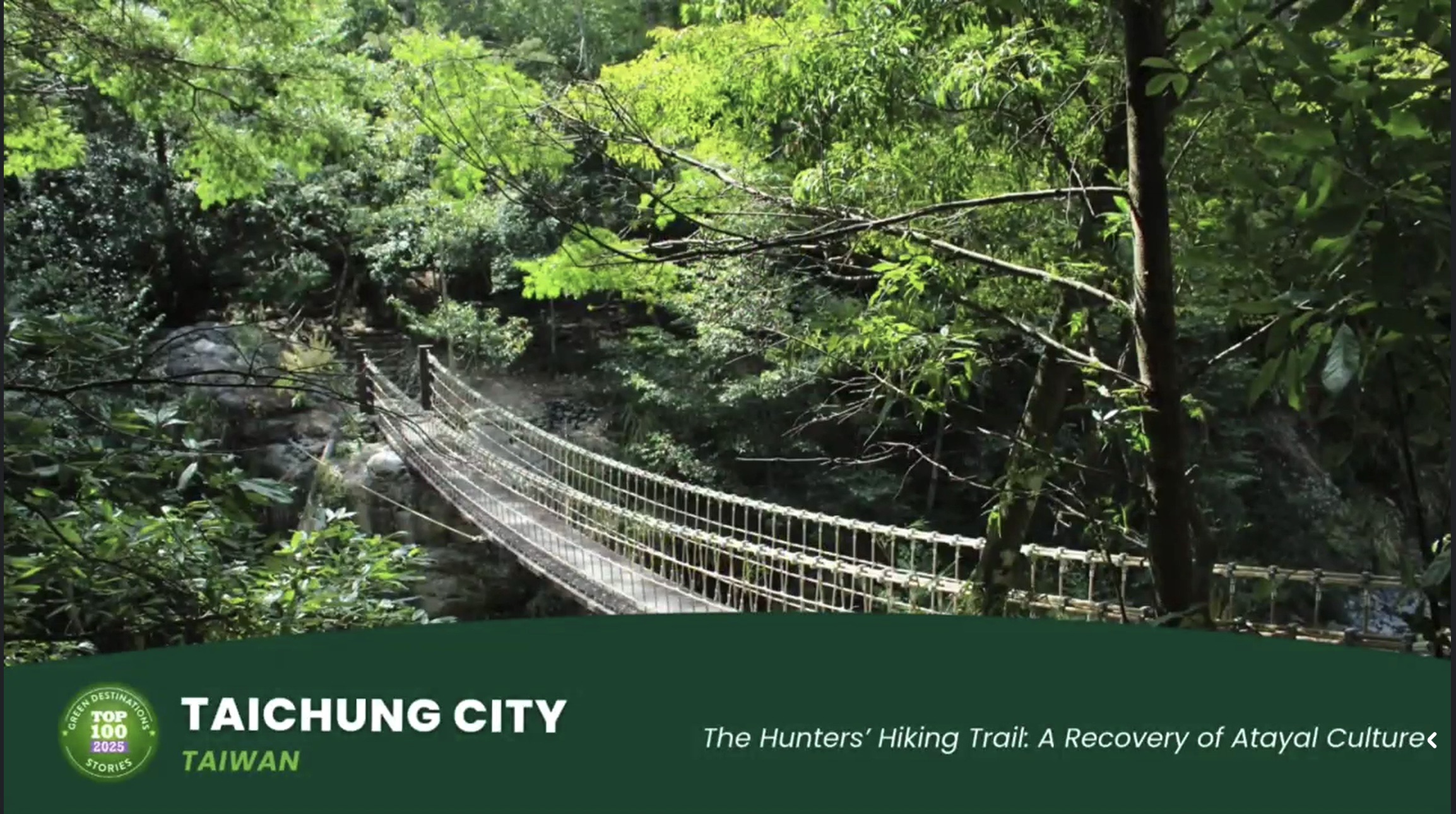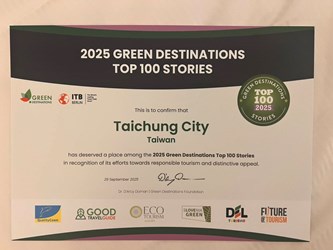 綠色旅遊目的地基金會(Green Destinations Foundation, GD)於9月28日至30日在法國奧克西塔尼舉辦「2025全球綠色目的地年會」,並頒發「2025全球百大目的地故事獎」(Green Destinations Top 100 Stories)。台中市政府觀光旅遊局以「環山獵人登山步道:重返獵人古徑、重現泰雅文化地景」脫穎而出,榮登全球百大故事,成為全國第一且唯一連續兩年獲獎的地方政府。同時,台灣味噌釀造文化館也以「在地文化成為永續旅遊的力量」,榮獲首屆「2025好旅行故事競賽」(Good Travel Stories Competition)獎項,展現公私協力推動永續的成果。