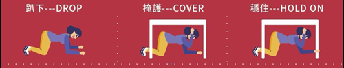 1.地震避難3步驟(趴下Drop、掩護Cover、穩住Hold on)。