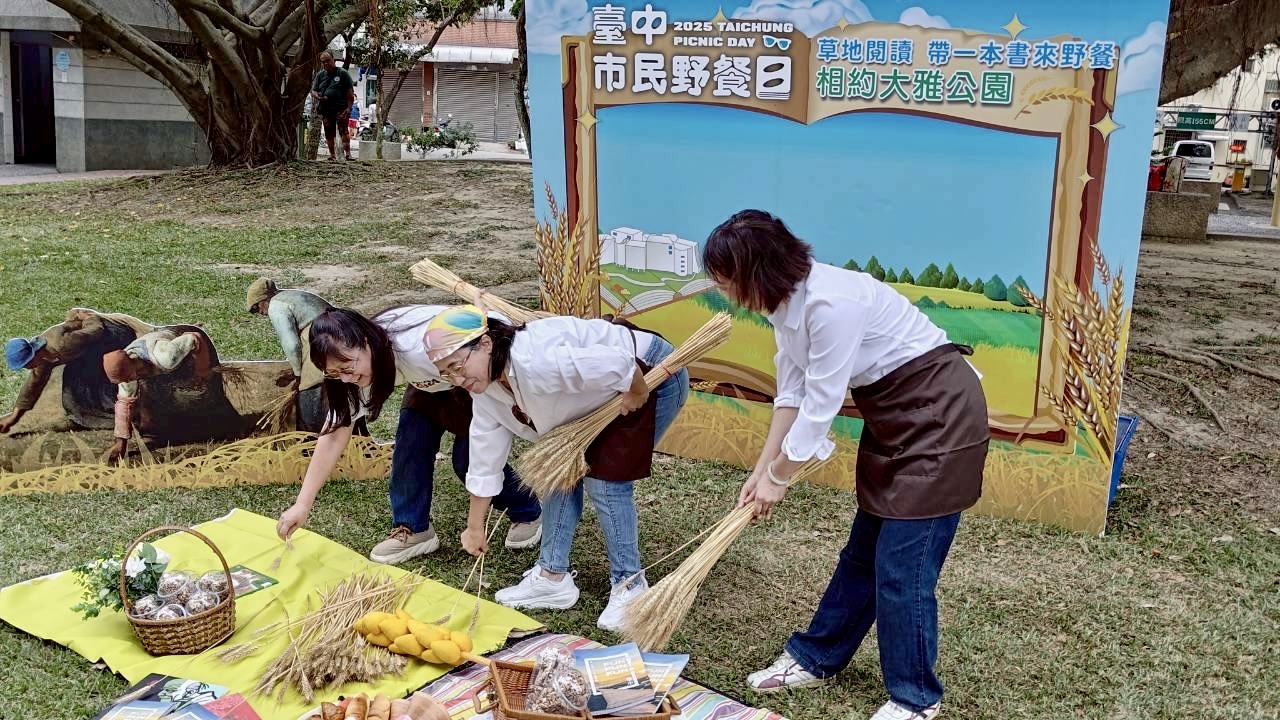 大雅區長林麗蓉補充,大雅野餐日在閱讀的主題下,融合音樂與藝術表演,邀請在地樂團登台演出,以溫暖旋律為草地增添節奏感。而最吸睛的莫過於「名畫重現」單元—今年以米勒經典畫作《拾穗》為主題背景,邀請民眾化身畫中人物進行cosplay,穿上田園風服飾、手持稻穗,在金黃草地間重現經典畫面,這在以小麥聞名全國的台中大雅,可謂是別具意義。這場藝術與自然的結合,成為熱絡的拍照打卡點,也象徵著大雅區民惜福與希望的精神內涵,有著勞動與閱讀並重的生活美學。