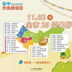 觀旅局補充,這週末台中活動非常精采,除了11月1日的「2025台中自行車嘉年華」,「2025第四屆台中市民野餐日」也將於11月2日盛大登場,於全市29區同步舉行,歡迎各地民眾安排兩天一夜的小旅行,週六騎單車、週日來野餐,來場今秋最chill的慢遊之旅!更多活動資訊,請關注「大玩台中-台中觀光旅遊局」粉絲專頁、台中觀光旅遊網(https://travel.taichung.gov.tw/)及「台中市民野餐日」粉絲專頁 (https://www.facebook.com/picnictaichung/ ) 。(10/30*10)*觀旅局
