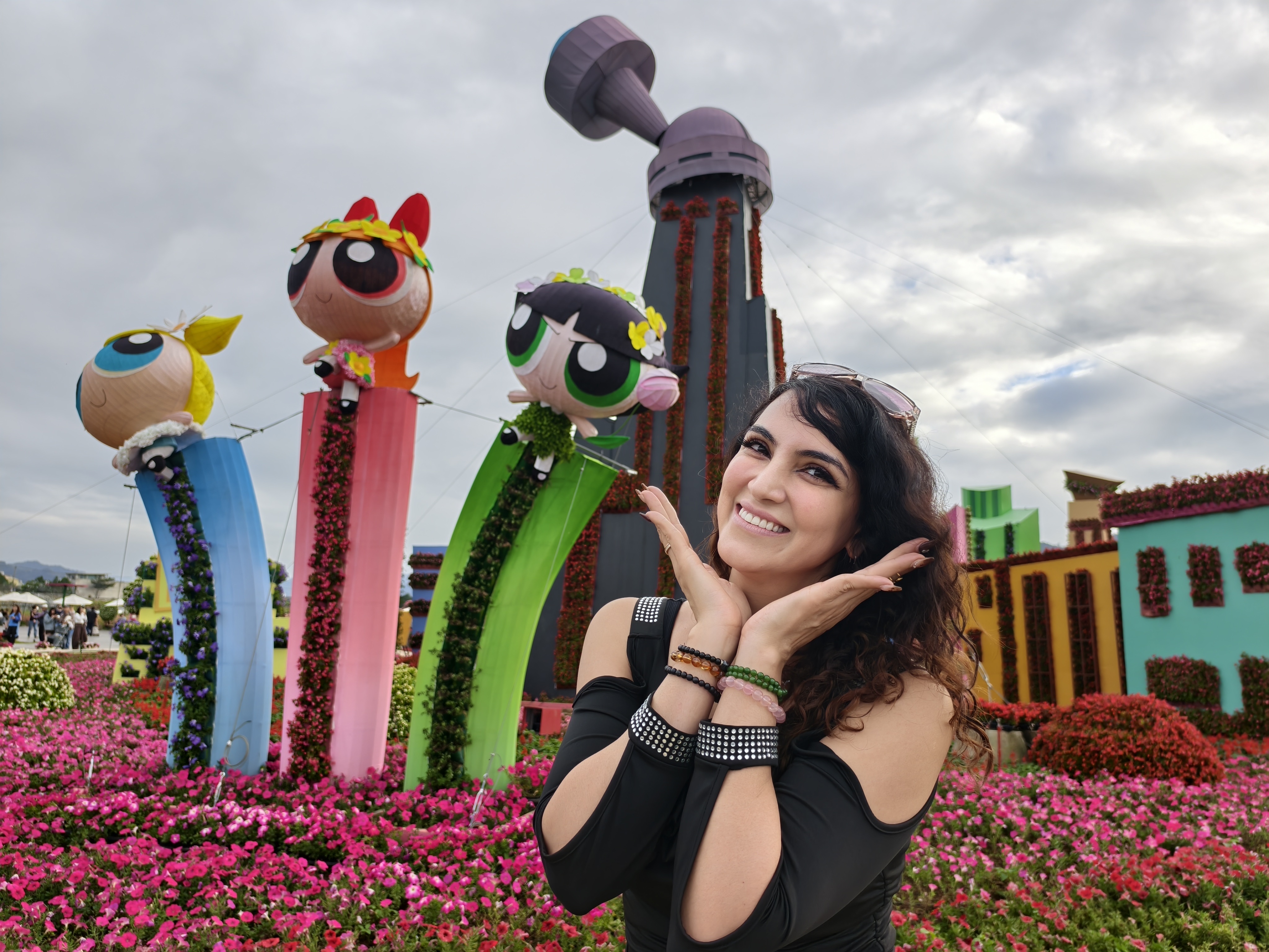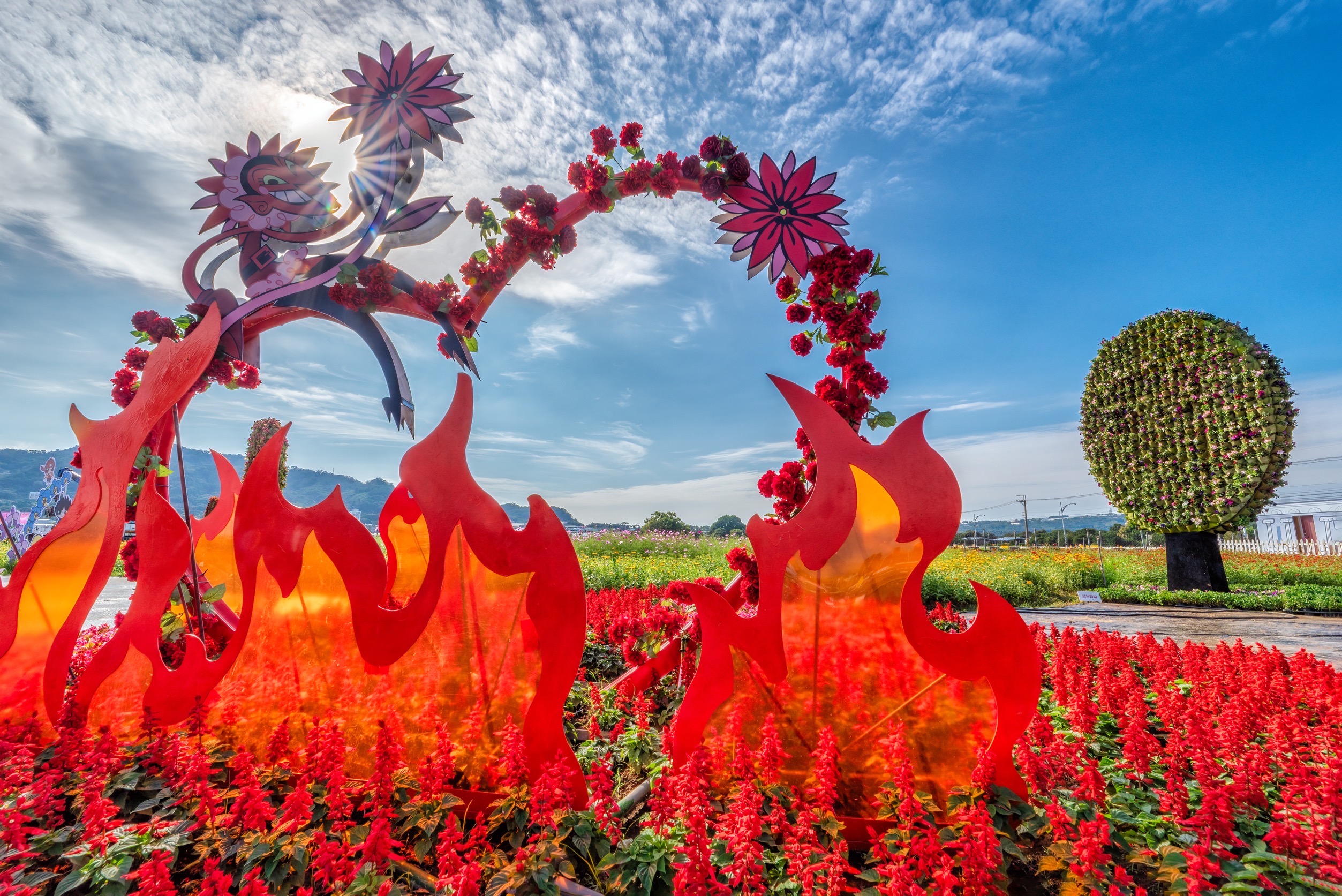 觀旅局長陳美秀表示,今年新社花海花毯節以「動畫元素 × 花卉藝術 × 永續共創」為策展核心,將備受喜愛的飛天小女警經典元素與在地花卉巧妙融合。現場共有15個裝置及角色立牌,是歷年最多。主花毯高18米、直徑60米,最高處聳立魔人啾啾基地,每半小時自動展演泡泡、水霧與機械動態,成為遊客爭相拍照的焦點。園區更設置場景裝置,如盪鞦韆與甜甜圈店,讓大小朋友都能身歷其境,親自參與冒險。