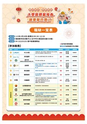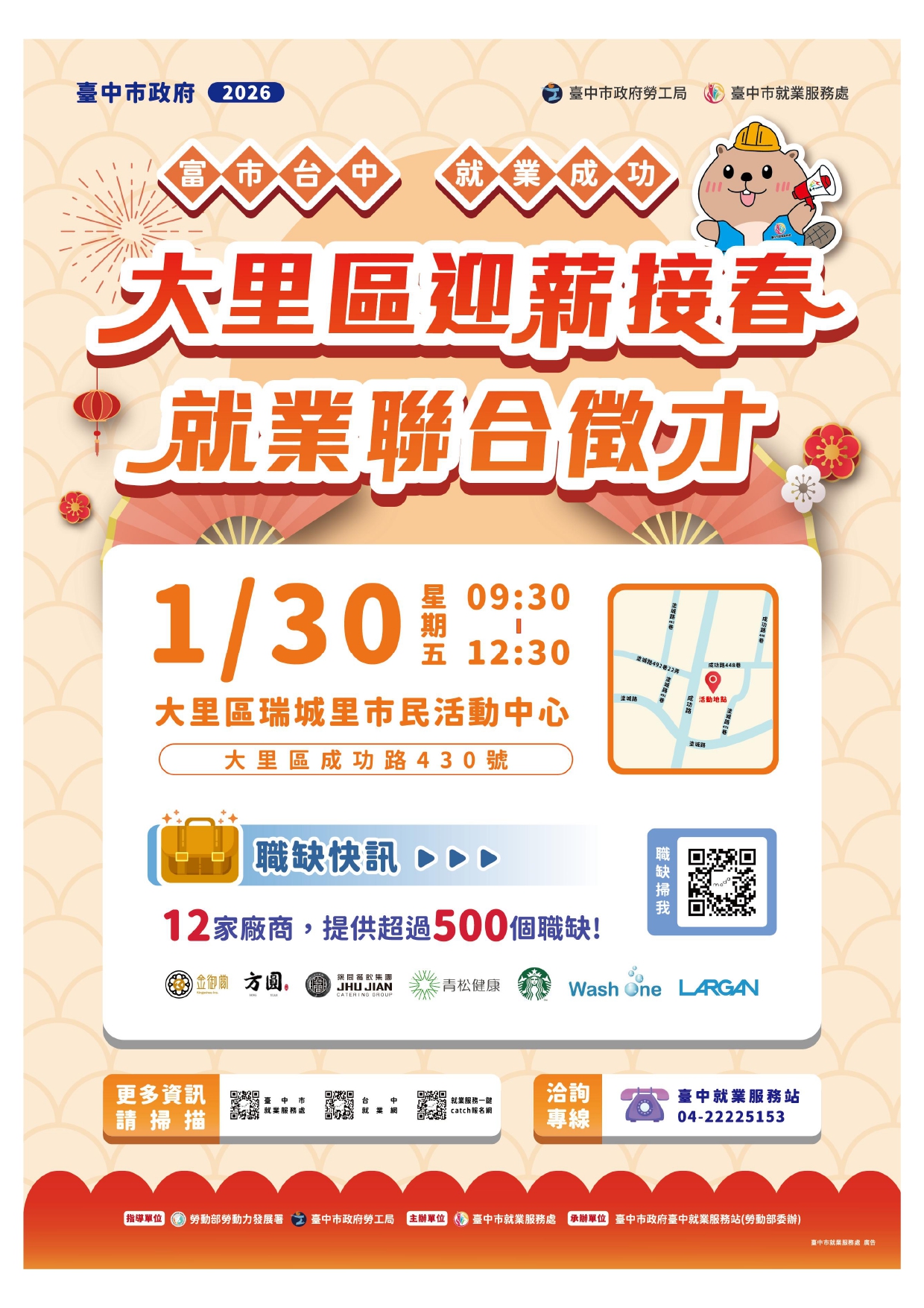 活動資訊 臺中市政府1月30日上午9:30至12:30,在大里瑞城里市民活動中心舉辦2026「富市台中 就業成功」大里區迎薪接春就業聯合徵才,邀請星巴克、大立光電、築間餐飲等12家廠商徵才,提供超過500個工作機會,查詢相關資訊:https://gov.tw/uLH,洽詢電話04-22225153。