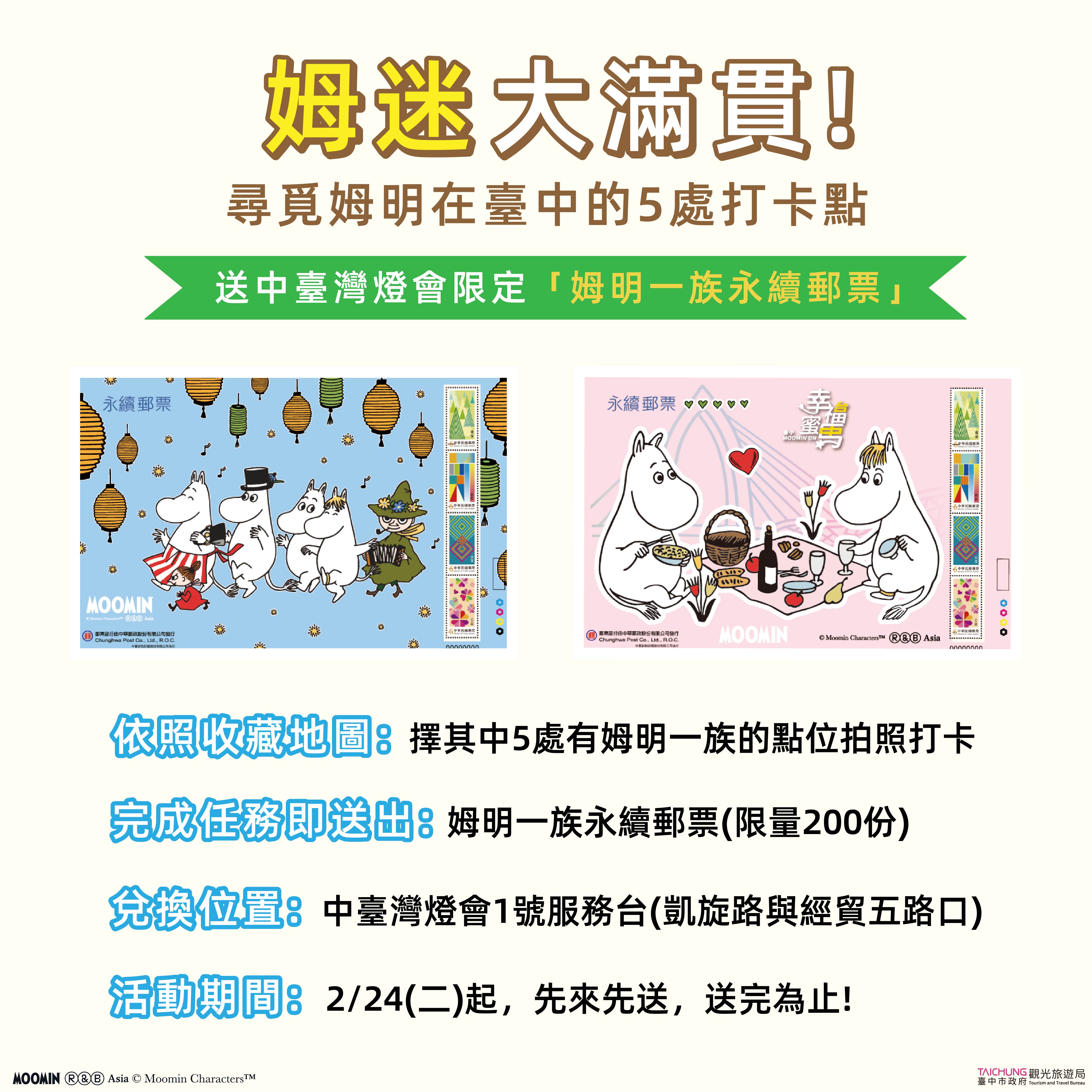 觀旅局長陳美秀表示,2026年的台中熱鬧非凡,中台灣燈會特別邀請各地民眾化身為經典賽強棒,依照「姆明一族台中收藏地圖」選5處氣偶或視覺看板拍照打卡,如同完成了一場精彩的「大滿貫全壘打」後,可至中台灣燈會1號服務台(凱旋路及經貿五路口)出示打卡證明,即可獲得價值$248元的「姆明一族永續郵票」,歡迎大家跟著收藏地圖,尋覓姆明的幸福足跡。