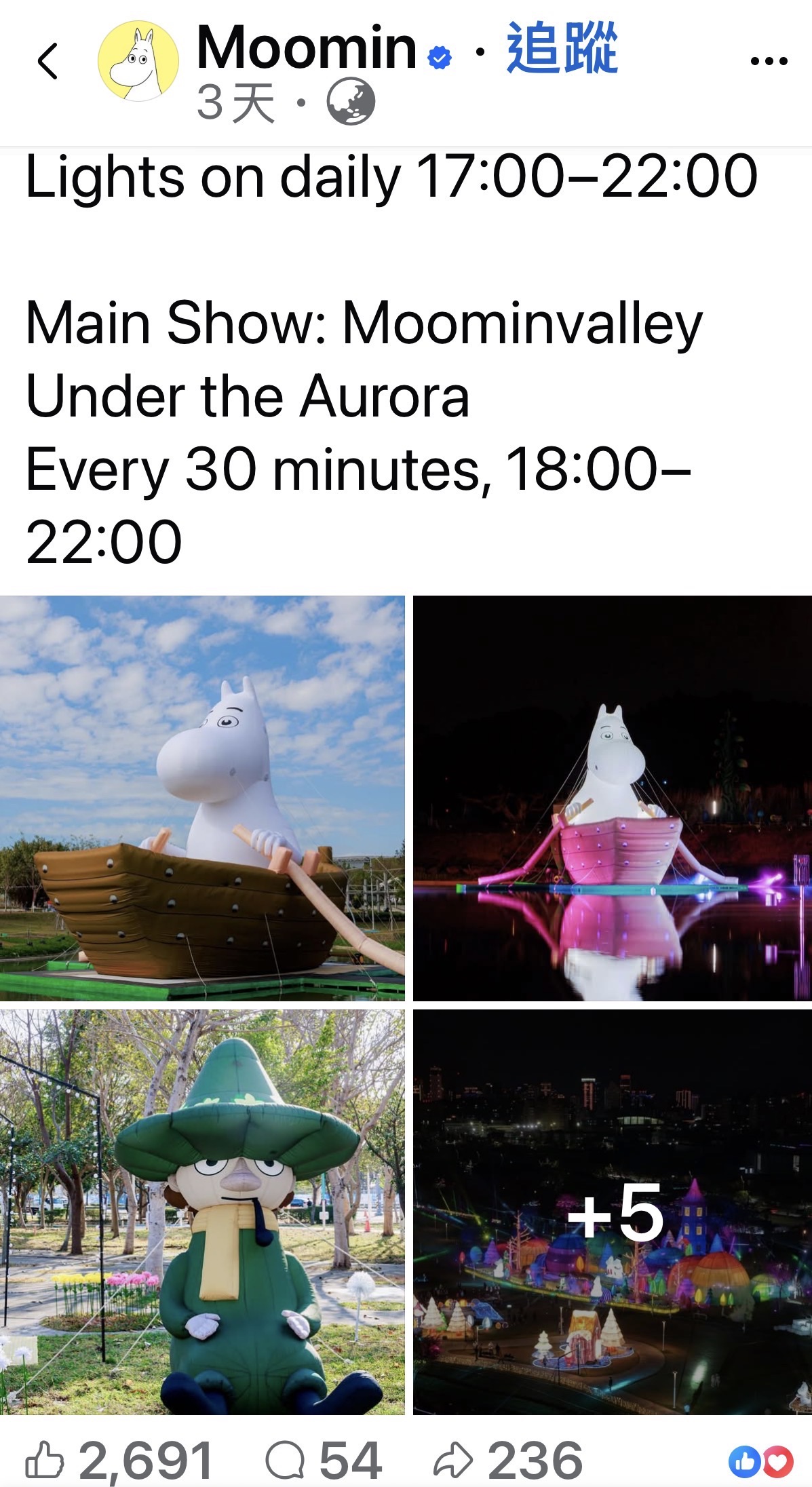 2026中台灣燈會展現驚人的吸引力,統計至昨(28)晚人潮已突破555萬大關,正式超越去年燈會的總參觀人次,預期將大幅刷新紀錄!今年最美燈會倒數計時中,只剩3天!國際知名 IP「姆明一族(The Moomins)」現身中台灣燈會,以「極光下的姆明谷」席捲全台,更紅到國際連Moomin全球官方社群都分享姆明登入台中中央公園,在極光下划船、露營的療癒魅力!這場姆明一族與北歐極光奇幻相遇的燈光盛宴,即將於3月3日正式謝幕,台中市政府今(1)日溫馨號召全國民眾把握最後賞燈機會,親自光臨超美、超夢幻、超出各界期待的中台灣燈會:「保證不虛此行!」