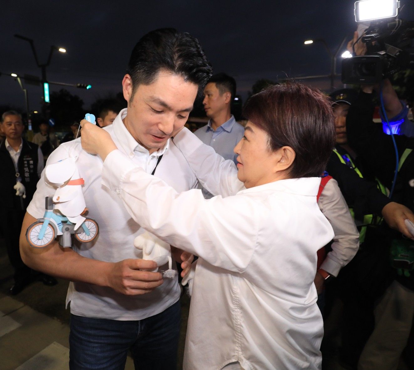 蔣市長強調,中台灣燈會辦得非常成功,主燈秀規劃細緻,結合在地特色與國際規格,堪稱世界級水準,直呼「金馬熊讚!」他也說,中台灣燈會有許多值得台北市學習的地方,因此特別請觀傳局團隊實地觀摩,交流取經,最後也祝身旁的立法院副院長江啟臣生日快樂,並恭喜中台灣燈會圓滿成功。