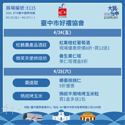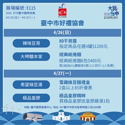 觀旅局補充,這次旅展有多家台中市優質公協會及業者合力展攤,為了慶祝台中國際會展中心的啟用,糕餅公會推出比照台中太陽餅節的買一送一優惠,並由2家業者參展,包括螞蟻來了甜點:烘焙日式蛋捲45元(買1送1);福委肉乾:香辣豬肉絲、香辣豬肉片、杏仁芝麻脆豬肉乾280元(買1送1)。中市好禮協會則聯合8家業者,於展覽期間推出隱藏版專屬優惠,包括松鶴農產品酒莊(4/24) 現場優惠原價8折,買12送1;微笑天使烘焙坊(4/24) 果仁塔禮盒8折;棗道甜(4/25) 9折優惠;炳叔烤玉米(4/25)買1盒多1包;辣味豆哥(4/26) 指定商品任選4罐1,200元;大呷麵本家(4/26) 經典紙捲麵6包400元買一組送DIY體驗券2張(2人同行,1人免費);希望綠豆湯(4/27) 兩盒以上85折優惠;極品皇膠(4/27)買極品皇膠送皇膠雞湯一包。